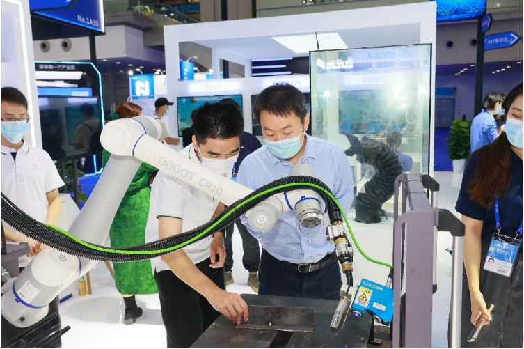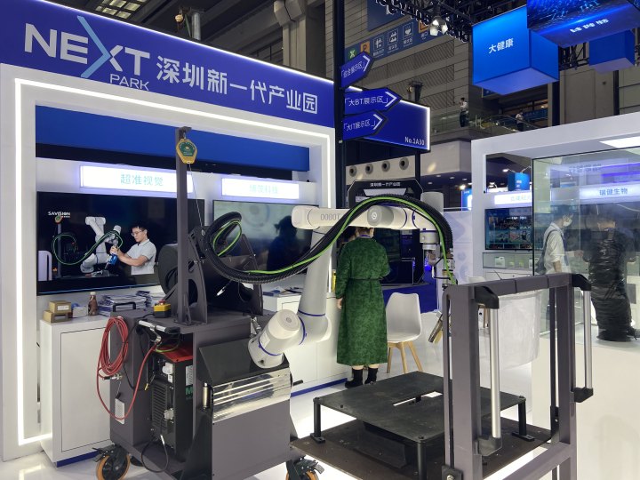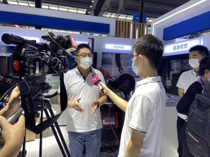 工作人員為觀眾介紹智能移動(dòng)焊接平臺(tái)的操作