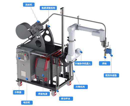 智能移動(dòng)焊接平臺(tái)主要機(jī)構(gòu)包含六軸協(xié)作機(jī)器人、焊接電源、送絲機(jī)、焊槍、移動(dòng)平臺(tái)、升降機(jī)構(gòu)、角度調(diào)整機(jī)構(gòu)、視覺(jué)傳感器、電控柜和手持盒等。其中六軸協(xié)作機(jī)器人可以通過(guò)拖拽的方式,完成軌跡示教;移動(dòng)平臺(tái)采用大尺寸萬(wàn)向輪以及采用輕量化設(shè)計(jì),可以有效提升小車(chē)的越障能力,輕松便捷的移動(dòng);升降機(jī)構(gòu)可以提升機(jī)器人的有效焊接區(qū)域,實(shí)現(xiàn)更高焊接位置覆蓋。視覺(jué)傳感器可實(shí)現(xiàn)自動(dòng)掃描尋跡,引導(dǎo)機(jī)器人完成精準(zhǔn)焊接。